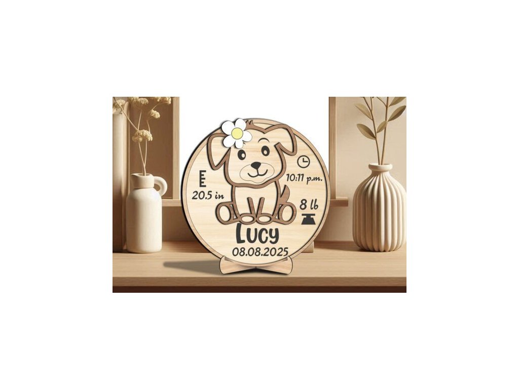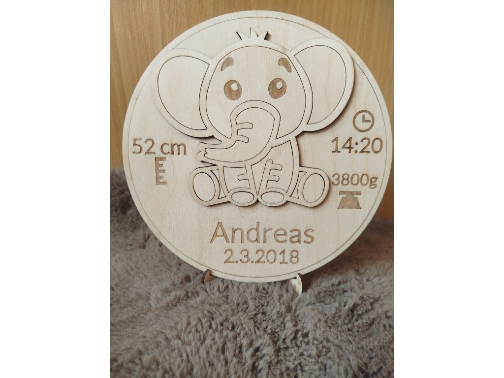 Roztomilý dětský milník se zvířátkem je precizně laserově řezaný a gravírovaný na CO₂ laseru z kvalitní dřevěné překližky. Milník lze plně personalizovat – obsahuje jméno dítěte, datum narození, čas, váhu a délku.