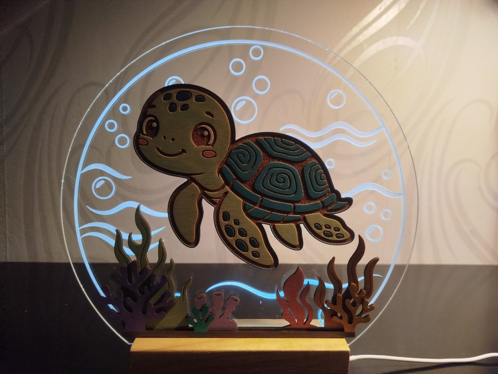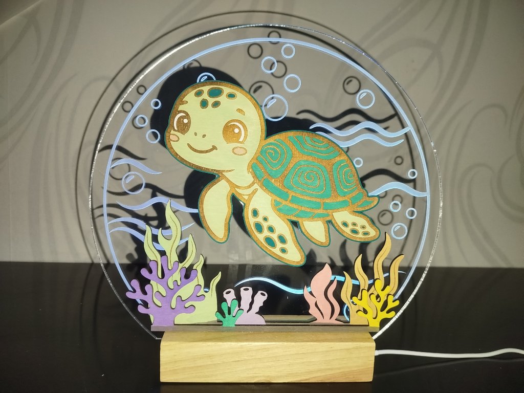 Plexi cedulka s motivem ručně malované želvičky je precizně gravírovaná CO₂ laserem do kvalitního plexiskla. Samotná želvička je vyřezaná do březové překližky a nalepená na plexi, které stojí v lampičce pro efektní podsvícení. Skvěle se hodí jako originální dekorace nebo jemný doplněk dětského pokojíku.